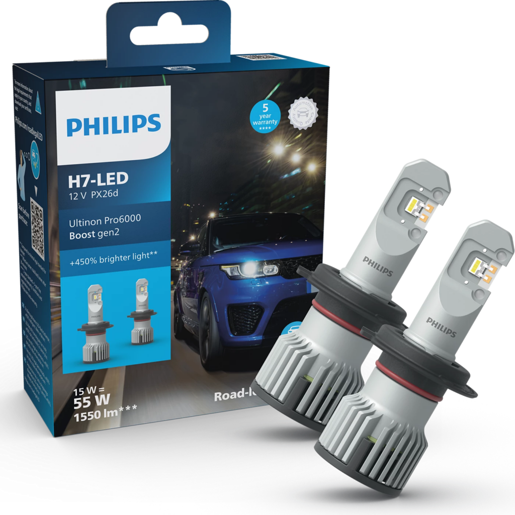 Impulsadas por tecnología LED avanzada y un diseño mejorado, la nueva generación de lámparas Philips Ultinon Pro6000 Boost H4-LED y H7-LED ofrece una arquitectura óptica optimizada y mayor visibilidad en carretera. El resultado es un asombroso incremento del +450% en el brillo que permite a los conductores ven más, con antelación y con absoluta claridad. La gama de LEDs Philips Ultinon Pro6000 Boost cubre tanto para la función de luces cortas como de largas, y ha sido probada y aprobada para una amplia gama de vehículos, incluyendo coches, motocicletas, autocaravanas, furgonetas y camiones2 ligeros.
